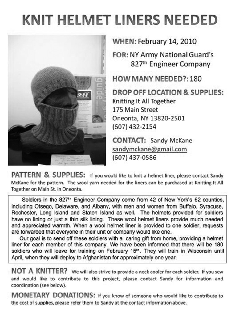 Knowing that your group of incredibly kind, caring, and dedicated knitters were working this whole time on these terrific helmet liners is such a great feeling. I now really feel like members of our community have been paying attention, and it is terrific that they all care enough to spend the time to make these liners. It really means a lot to the soldiers and their families.