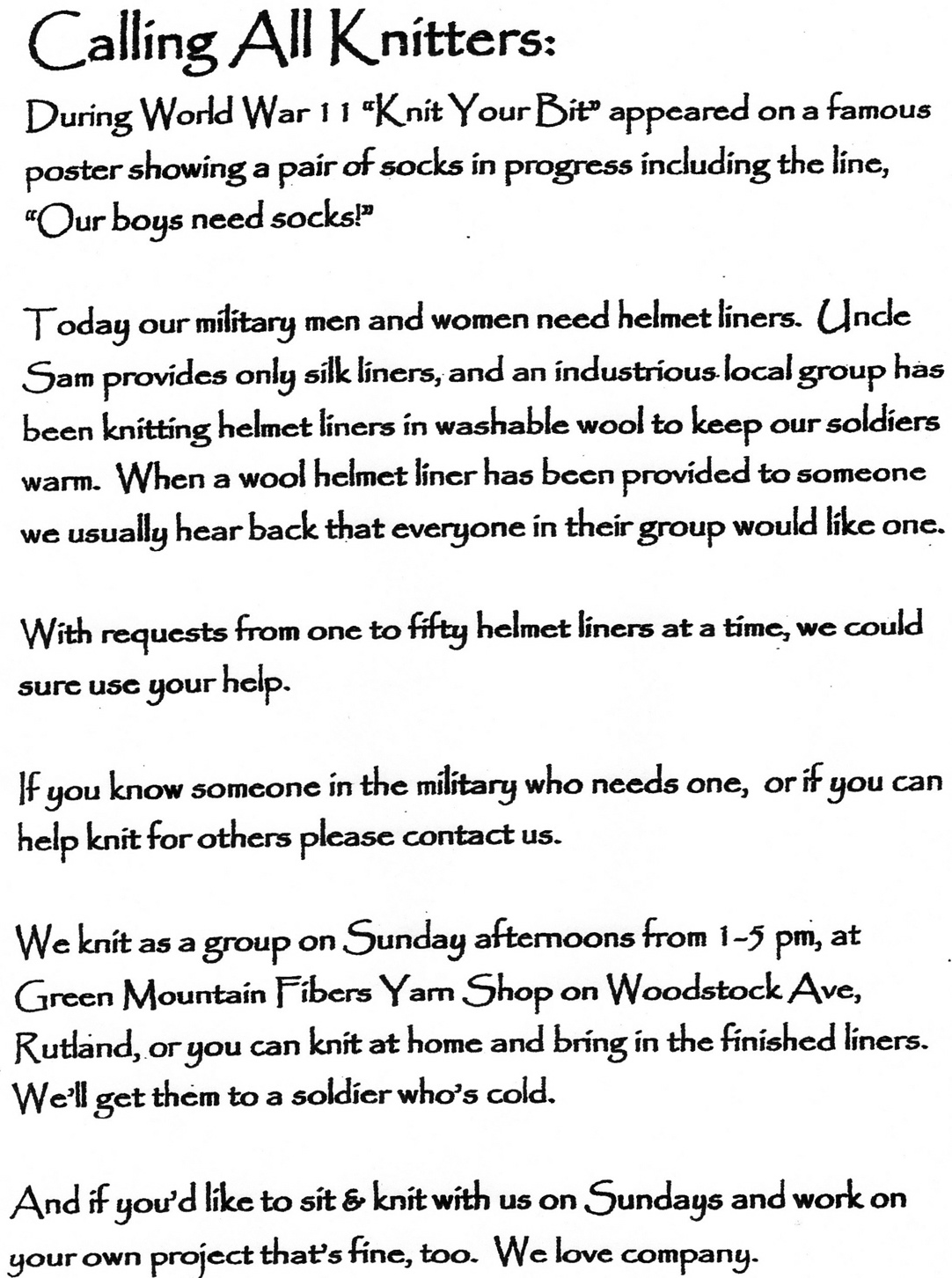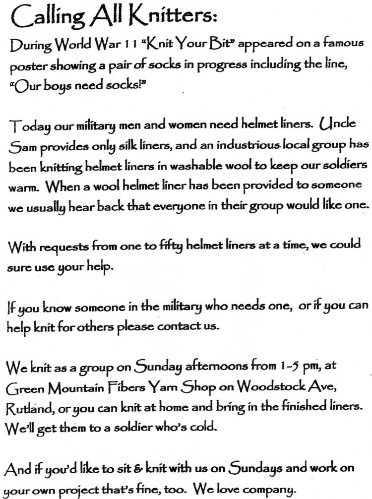 Over the next few days, as I toyed with the idea of how to make 180 liners, family members came up with ideas. My husband’s aunt suggested a radio interview, my husband suggested a newspaper interview, my daughter Genevieve suggested making a version of the Vermont flyer with our information and a completion date to enlist the help of our local knitting store.