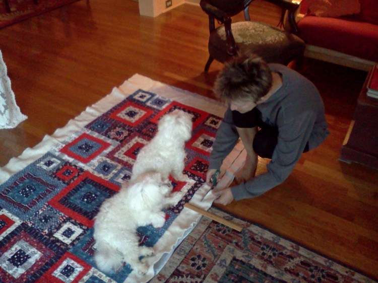 Charlotte and I decided to make one. We picked out the fabrics and then divided up the tasks: Charlotte worked on choosing fabrics to create the specific designs for each block and cut the pieces. I did the sewing and she did the pressing and layout. Oscar and Issie helped with the final quilting stage!