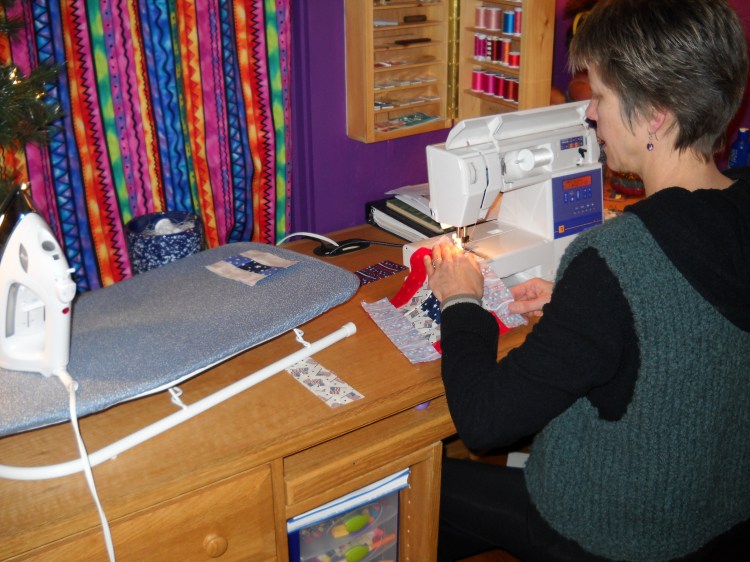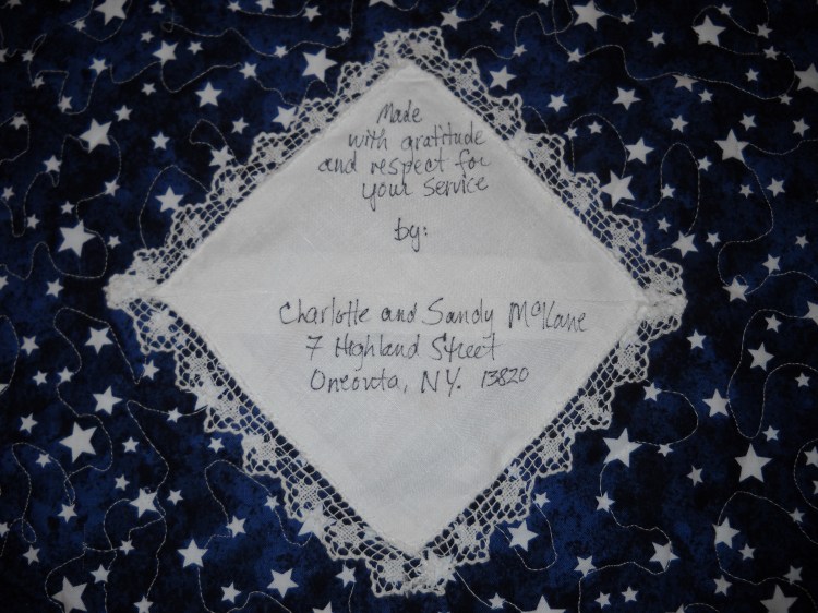 “We received a few badly injured US soldiers late last night. One was in surgery for several hours, and is very critically injured. We are now sending him for further care back home, through a number of trips. This morning, when I came around the units to see the new admissions, I noticed that he was covered from his feet, up to his chest, in a beautiful red/white/and blue quilt. I am sure he was warmed by the obvious care and affection you put into making that quilt. At the top of the quilt is pinned his purple heart, given to him by the soldiers of his unit who gathered around his bed, and touched the quilt you made. I wanted you to be aware of this so that you could be proud of your work making a blanket that could never been put to better use than the one it serves now, warming him in the aircraft home.”