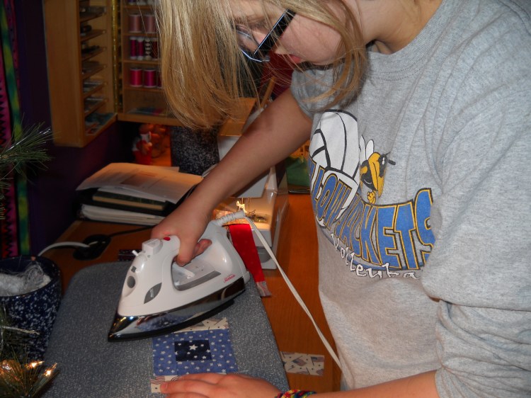 We discovered we had enough leftover material to make two quilts. We forgot, however, that the required quilt batting was 100% cotton. We discovered this between quilts. The first quilt with the wrong batting material was donated to a veteran’s home in Bennington,Vermont, with this response: “The quilt you had donated is currently displayed on a table in the main reception area at the Vermont Veterans’ Home. Visitors and Veterans think it is beautiful and enjoy it.”